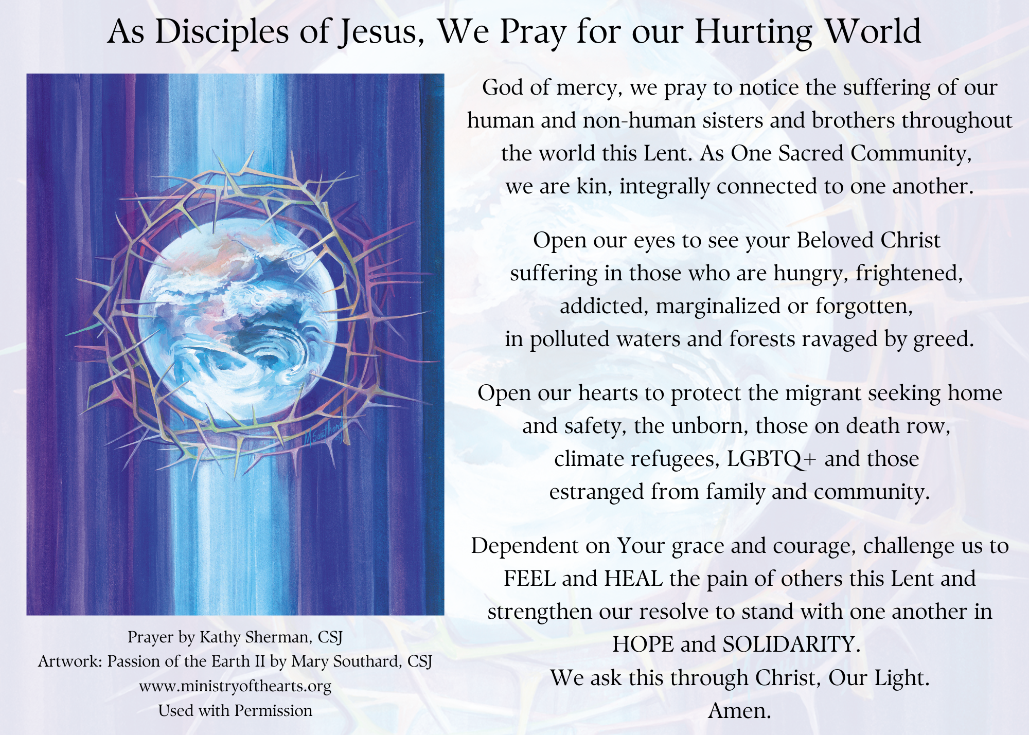Mary Southard, a Sister of St. Joseph, is an artist whose Paintings reflect her close connection to and love for the Natural World and what it is to be a participant in this magnificent Universe. Her paintings and sculptures explore and give expression to our soul journey within this intimate, interconnected Sacred Community of life, with all its beauty and pain, its passion and mystery.